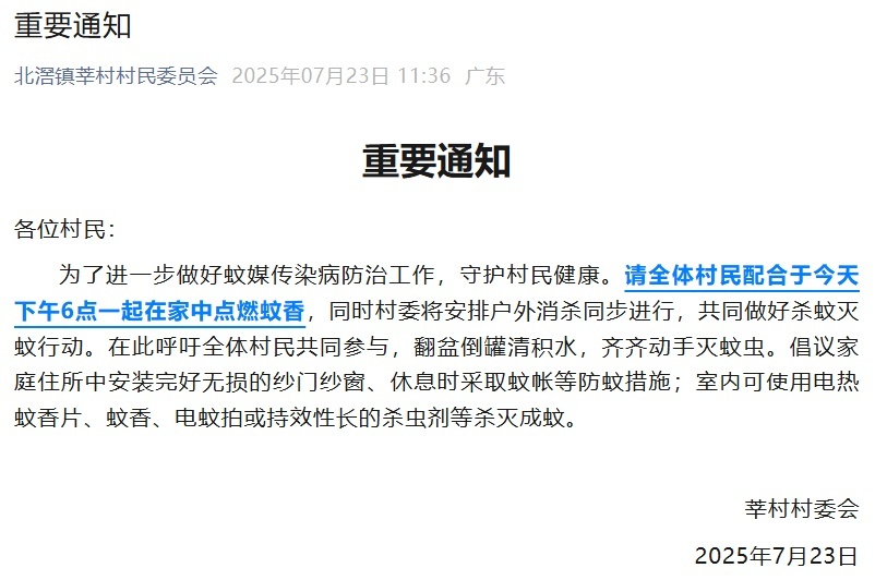 7月23日,佛山顺德北滘镇莘村村委会发布“重要通知”称,为了进一步做好蚊媒传染病防治工作,守护村民健康。请全体村民配合于23日下午6点一起在家中点燃蚊香,同时村委安排户外消杀同步进行,共同做好杀蚊灭蚊行动。在此呼吁全体村民共同参与,翻盆倒罐清积水,齐齐动手灭蚊虫。倡议家庭住所中安装完好无损的纱门纱窗、休息时采取蚊帐等防蚊措施;室内可使用电热蚊香片、蚊香、电蚊拍或持效性长的杀虫剂等杀灭成蚊。