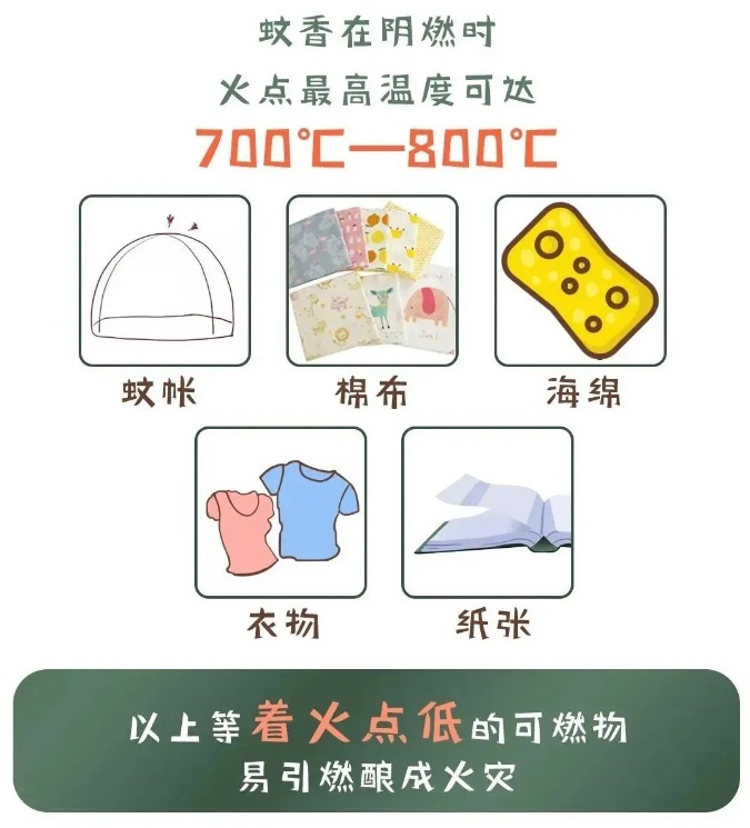 蚊香在阴燃时,内部最高温度可达700℃—800℃,足可将蚊帐、棉布、海绵、纸张等可燃物引燃,引发火灾。