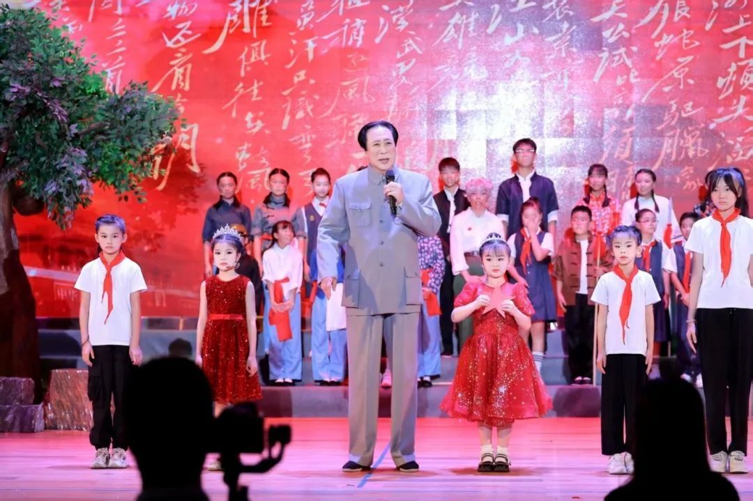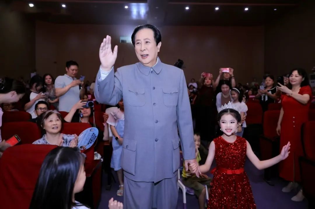 毛泽东特型演员(国家一级演员)钱大威与蔡心缘小朋友合唱《东方红》,千面红旗随《沁园春·雪》朗诵翻涌成海。